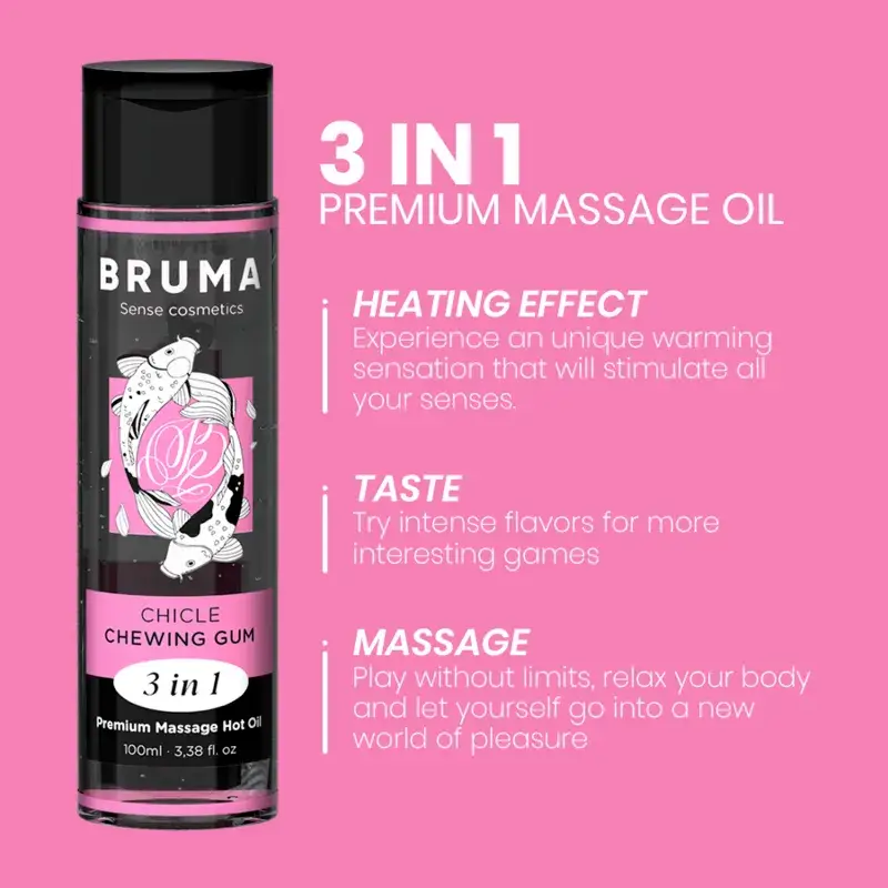 Immagina un olio che non solo accarezza la tua pelle, ma la avvolge in un calore delicato, mentre il profumo dolce e giocoso del chewing gum risveglia i tuoi sensi, trasformando ogni tocco in un’esperienza indimenticabile. L’olio da massaggio al gusto chewing gum con effetto calore BRUMA è un concentrato di piacere e raffinatezza, un flacone da 100 ml che racchiude il potere di rendere ogni momento un’esperienza sensuale, rilassante e profondamente appagante.